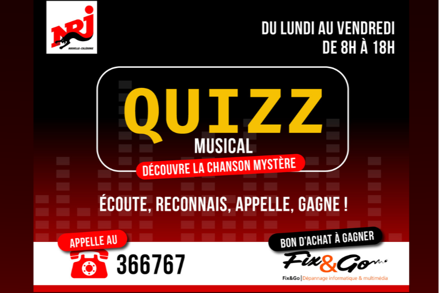 À l’antenne, quelques notes suffisent pour tout gagner… ou tout faire monter ! Chaque jour, deux auditeurs tentent leur chance pour identifier la chanson mystère et décrocher une cagnotte qui commence dès 3000 FCFP. Sauras-tu trouver le bon titre au bon moment en composant le 366767* et repartir avec la cagnotte chez Fix & Go ?
